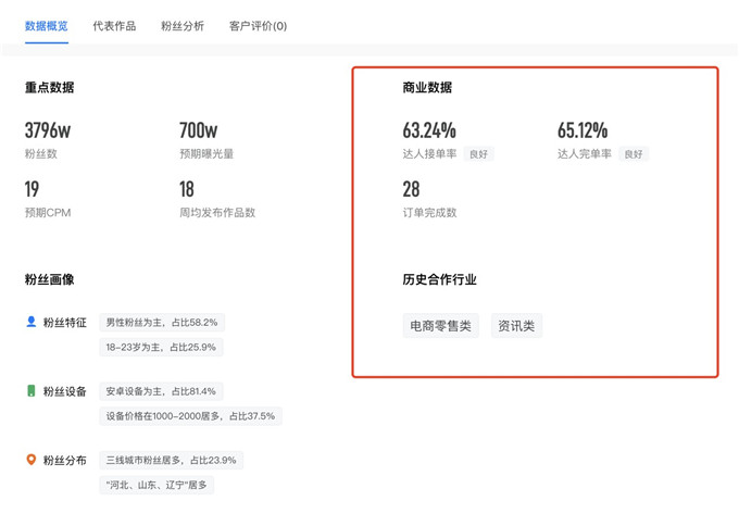 本次升級,為了幫助品牌更好地判斷達人的商業(yè)合作經(jīng)驗以及信任度,在達人原有內(nèi)容維度數(shù)據(jù)基礎(chǔ)上,增加了歷史接單率、完單率、訂單完成數(shù)、合作客戶數(shù)、歷史合作行業(yè)等商業(yè)行為數(shù)據(jù)。