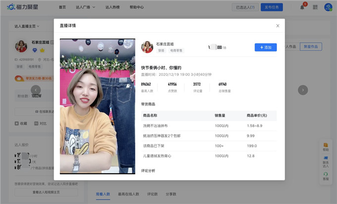 而在達人內(nèi)容及效果的優(yōu)質(zhì)度判斷上,磁力聚星也做出了突破性的升級:在過去只有歷史商業(yè)作品播放量、點贊數(shù)的基礎(chǔ)上,增加了對單一視頻/直播的商業(yè)行為數(shù)據(jù)維度,如評論數(shù)、銷售量及評論內(nèi)容分析,其中直播商單的歷史數(shù)據(jù)分析還會多一項“該場直播帶貨商品詳情”的數(shù)據(jù),該場直播的帶貨商品詳情及對應(yīng)銷量均公開可見。
