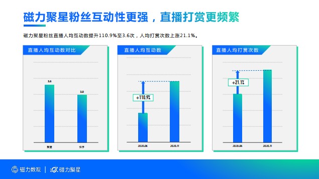 如何讓品牌的投放真正做到有聲響?粉絲活躍度是諸多品牌考量的因素?!秷?bào)告》顯示,磁力聚星粉絲點(diǎn)贊數(shù)、分享數(shù)和短視頻完播率均有提升,直播人均互動(dòng)數(shù)提升110.9%,人均打賞次數(shù)上漲21.1%,互動(dòng)性更強(qiáng)。