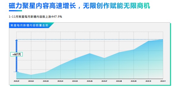 創(chuàng)作者的持續(xù)增長(zhǎng)也帶來(lái)了創(chuàng)作內(nèi)容的欣欣向榮。2020年1-11月,聚星內(nèi)容高速增長(zhǎng),每月新增內(nèi)容數(shù)上漲高達(dá)447.9%,蘊(yùn)藏了無(wú)限創(chuàng)意潛力和無(wú)限商機(jī)。