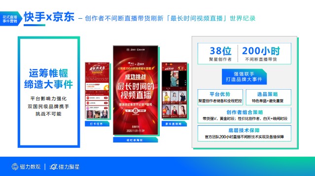 受疫情影響,2020年線下營(yíng)銷場(chǎng)景被迫停擺,在這樣的背景下,線上直播也成為了營(yíng)銷新風(fēng)口,變成品牌挖掘市場(chǎng)增量的有力武器。在這一方面,快手磁力聚星強(qiáng)勢(shì)領(lǐng)跑,11月直播場(chǎng)次對(duì)比6月上漲32.8%,直播均場(chǎng)時(shí)長(zhǎng)上漲60.4%,做到直播高頻且時(shí)“長(zhǎng)”。例如,在與京東的合作中,38位聚星創(chuàng)作者不間斷直播帶貨200小時(shí),成功挑戰(zhàn)最長(zhǎng)時(shí)間的視頻直播,花式內(nèi)容也讓不同品牌在直播中探索全新可能,找到適合自己的傳播姿態(tài)。
