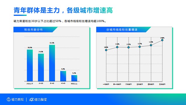 近兩年,眾多品牌紛紛選擇在短視頻平臺(tái)快手上進(jìn)行品牌和營(yíng)銷活動(dòng),也是看中其平臺(tái)上的用戶群體與當(dāng)下的目標(biāo)消費(fèi)群體高度重合,為商業(yè)價(jià)值變現(xiàn)提供了源頭活水。《報(bào)告》顯示,磁力聚星粉絲以青年群體為主,30歲以下粉絲占比超50%,并且各城市線級(jí)粉絲增速均超過(guò)100%,五線城市粉絲增速尤為迅猛。