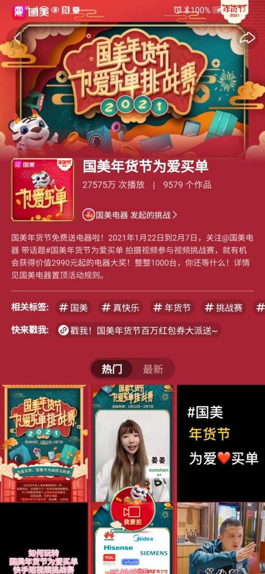 隨著社交+娛樂(lè)化消費(fèi)潮流趨勢(shì)異軍突起,國(guó)美在2021年1月重磅推出全新娛樂(lè)化、社交化新零售平臺(tái)“真快樂(lè)”APP。恰逢傳統(tǒng)春節(jié)到來(lái),國(guó)美策劃新春重磅活動(dòng)“國(guó)美年貨節(jié)”,為了更好的為活動(dòng)引流,給更多人展示國(guó)美煥然一新的品牌形象,國(guó)美繼“雙十一”合作后,再度攜手快手磁力引擎啟動(dòng)年貨節(jié)營(yíng)銷。本次活動(dòng)充分利用快手自身平臺(tái)優(yōu)勢(shì),打出“熱議話題挑戰(zhàn)+王牌主播PK”的殺手锏,成功助力此次國(guó)美年貨節(jié)主題活動(dòng)營(yíng)銷。
