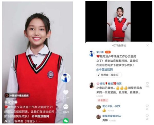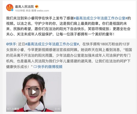 3月3日早上,擁有超1800萬粉絲的快手小音樂人@宋小睿(ID:190367)發(fā)布了一則視頻,對少年法庭辦公室的成立點贊:“祖國的花朵,離不開法治的陽光雨露。少年法庭辦公室是加強未成年人司法保護的專門機構(gòu),也是最高人民法院為我們少年兒童搭建的‘避風港’。感謝法官叔叔阿姨,讓我們可以在法治的呵護下,更加健康快樂的成長!”