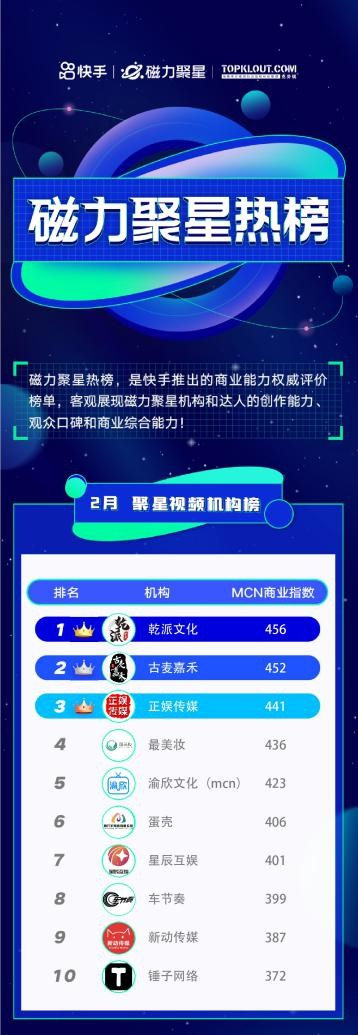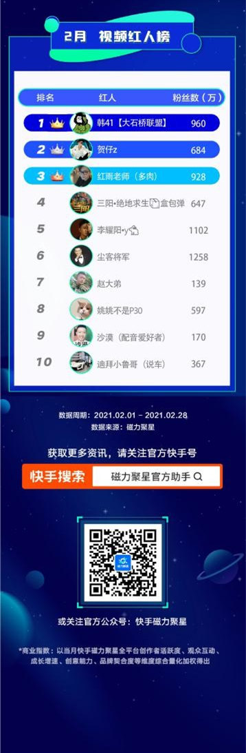 近日,快手磁力聚星發(fā)布2021年2月榜單。本月又有不少新面孔憑實力躋身榜單,一展他們的內(nèi)容創(chuàng)作力和品牌吸引力。