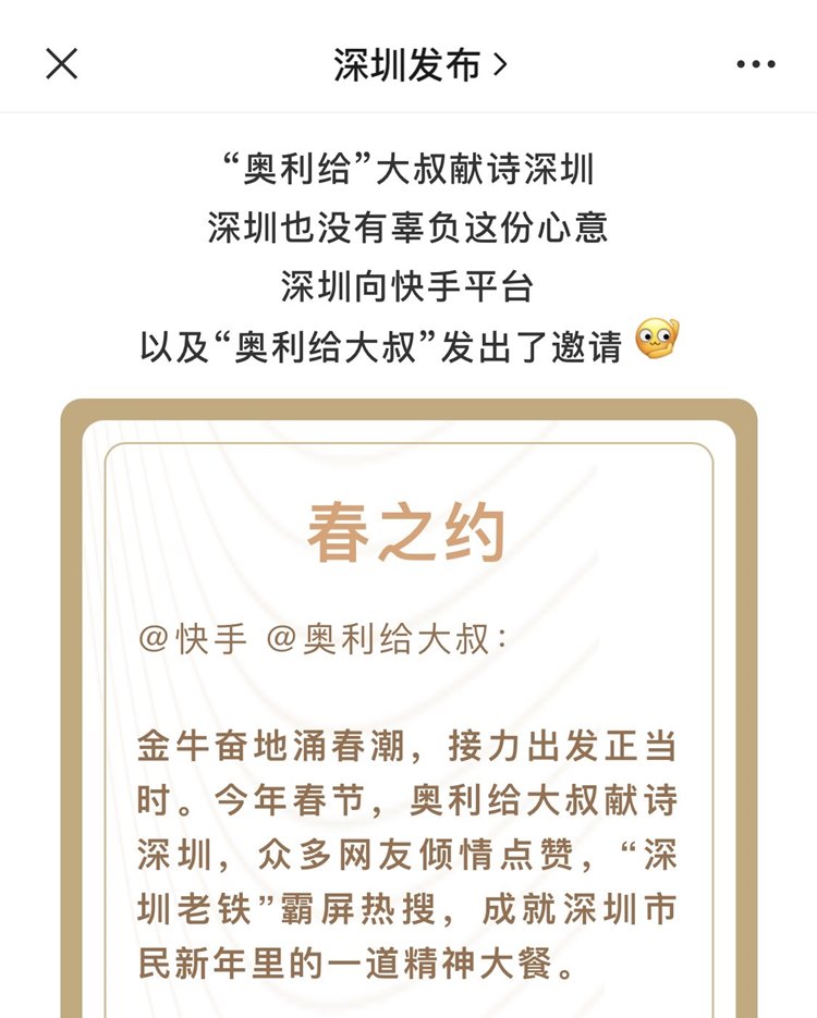 深圳在這篇名為《春之約》的邀約信里寫道:感謝“奧利給大叔”送深圳“奧利給”, 感謝快手這一有溫度的平臺,讓無數(shù)在深的和不在深的勵志奮斗者有機(jī)會被看見,成為一個溫暖的橋梁。誠邀快手及“奧利給大叔”去深圳,尋找春天的故事,與新時代深圳精神同頻共振,一同前行。