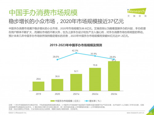4月22日,B站會員購聯(lián)合艾瑞咨詢發(fā)布《中國Z世代手辦消費(fèi)趨勢研究報告》(以下簡稱《研究報告》)稱,中國手辦消費(fèi)市場屬于穩(wěn)步增長的小眾市場,2020年市場規(guī)模為36.6億元,預(yù)計2023年中國手辦市場規(guī)模還將達(dá)91.2億元。