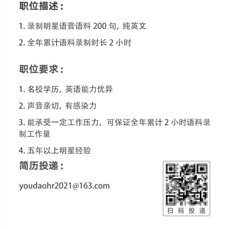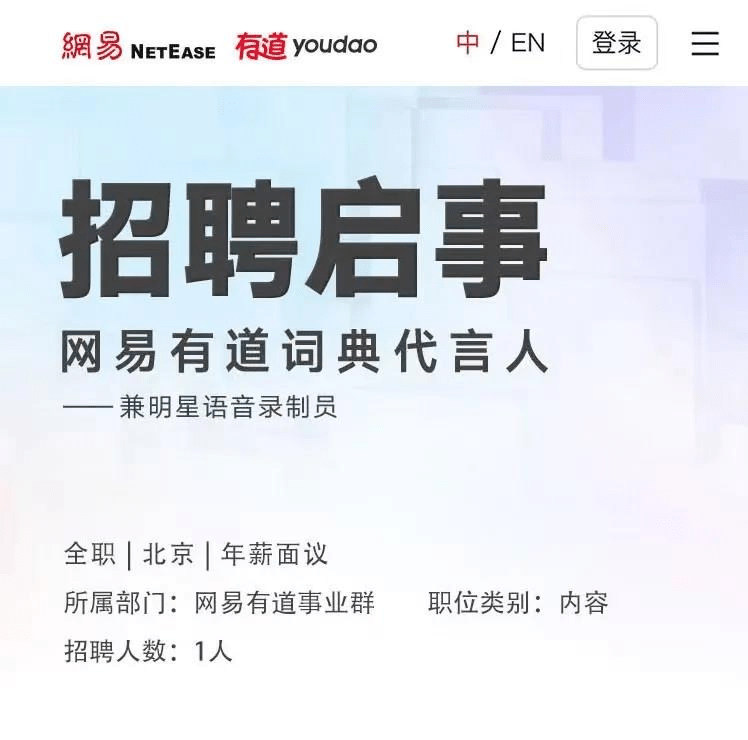 觀察發(fā)現(xiàn),網(wǎng)易有道詞典的第一步動(dòng)作是在“金三銀四招聘季”發(fā)布了一則招聘啟事,招聘“明星代言人兼明星錄音員”。
