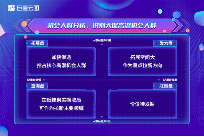 · 拓展盤:5A重合度低且人群畫像TGI高,則這類人群同樣應(yīng)當(dāng)被重點(diǎn)用作拉新,需要加速滲透,搶占高潛機(jī)會(huì)人群;