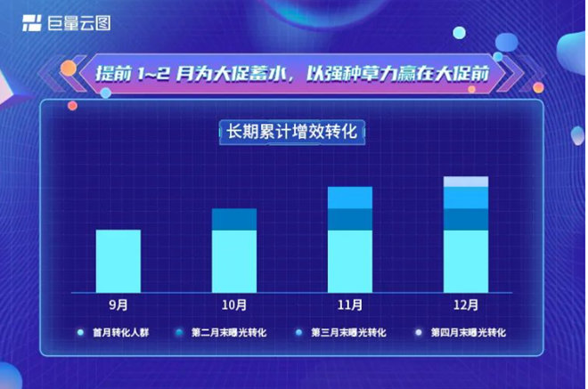 根據(jù)長(zhǎng)期增效實(shí)驗(yàn),巨量云圖發(fā)現(xiàn),品牌商家首月觸達(dá)人群即使在未來的三個(gè)月不做曝光,也仍然會(huì)有持續(xù)的轉(zhuǎn)化率。當(dāng)月營(yíng)銷所產(chǎn)生的轉(zhuǎn)化,其實(shí)只占長(zhǎng)期帶來的所有轉(zhuǎn)化的60~70%。這意味著,為了贏在618這樣關(guān)鍵大促節(jié)點(diǎn),商家必須提前做好充分的人群準(zhǔn)備,讓長(zhǎng)期增效的價(jià)值恰好落在大促節(jié)點(diǎn),再結(jié)合大促或營(yíng)銷節(jié)點(diǎn)期間的投放,從而讓整個(gè)活動(dòng)的銷量最大化。