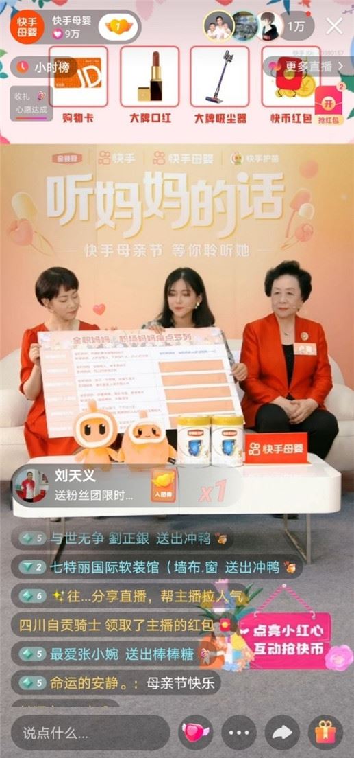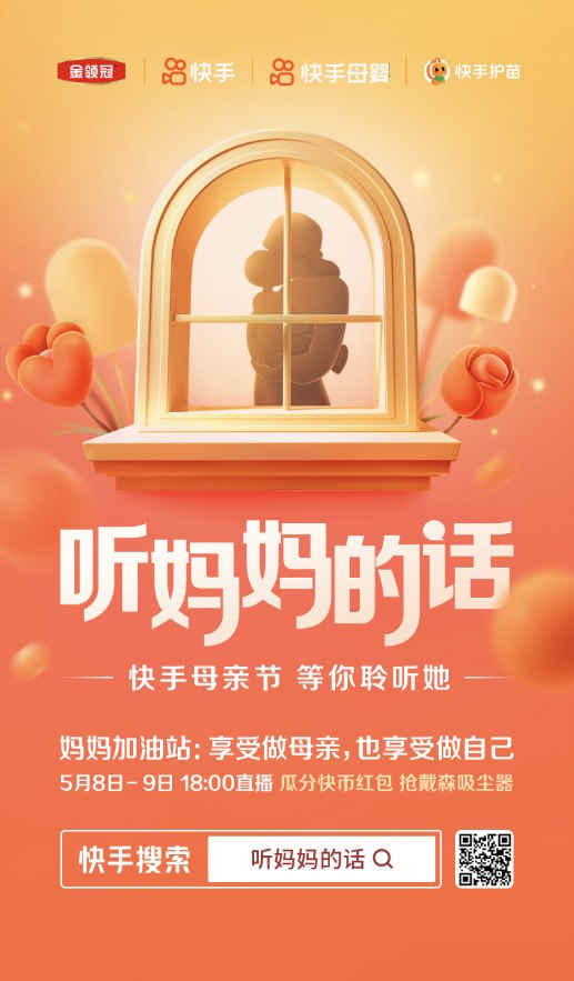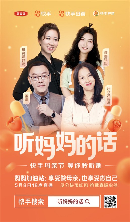 據(jù)了解,此次直播是快手母嬰關(guān)懷媽媽活動周發(fā)起的訪談系列直播的第二場。5月1日至5月9日,快手啟動母親節(jié)系列活動,并于5月8日和5月9日每晚18點(diǎn)連續(xù)推出兩場“聽媽媽的話”專題直播,由知名心理專家雷明等“育兒圈”頂流大咖,攜手開心好奇媽、機(jī)靈姐媽媽、郡郡媽媽組成的快手達(dá)人媽媽團(tuán),傾聽媽媽的聲音,聚焦隱形爸爸、隔代育兒、原生家庭等熱點(diǎn)議題,為寶爸寶媽們帶來科學(xué)育兒的專業(yè)建議。此外,直播間還為粉絲們準(zhǔn)備了京東購物卡、戴森吸塵器、TF口紅等多重驚喜。