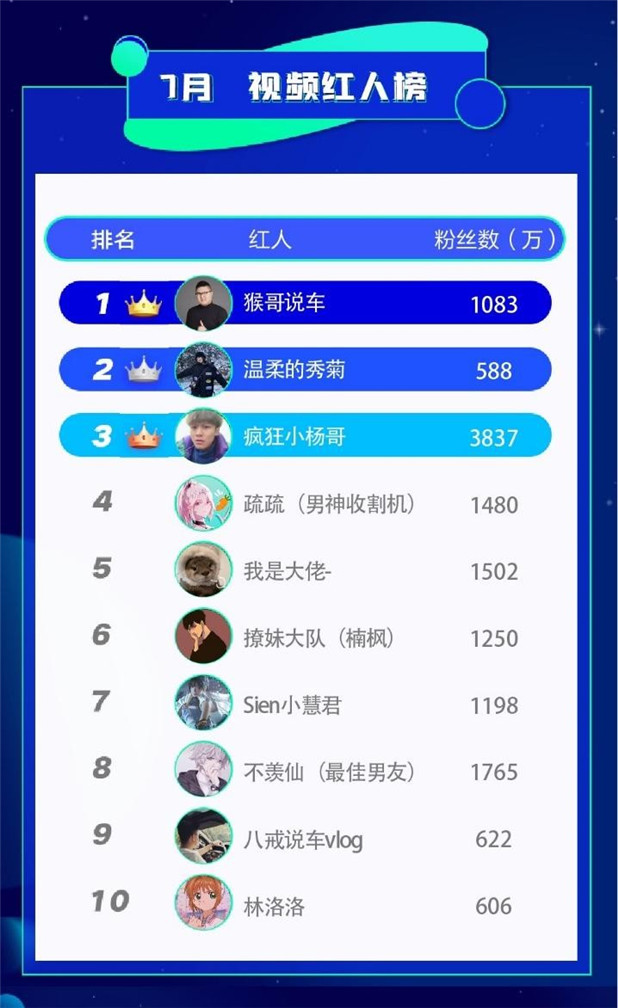 在7月視頻紅人榜中,猴哥說車躍居榜首,另一位汽車領域達人八戒說車vlog也出現(xiàn)在榜單中。值得一提的是,娛樂劇情類達人溫柔的秀菊、二次元達人Sien小慧君首次上榜。