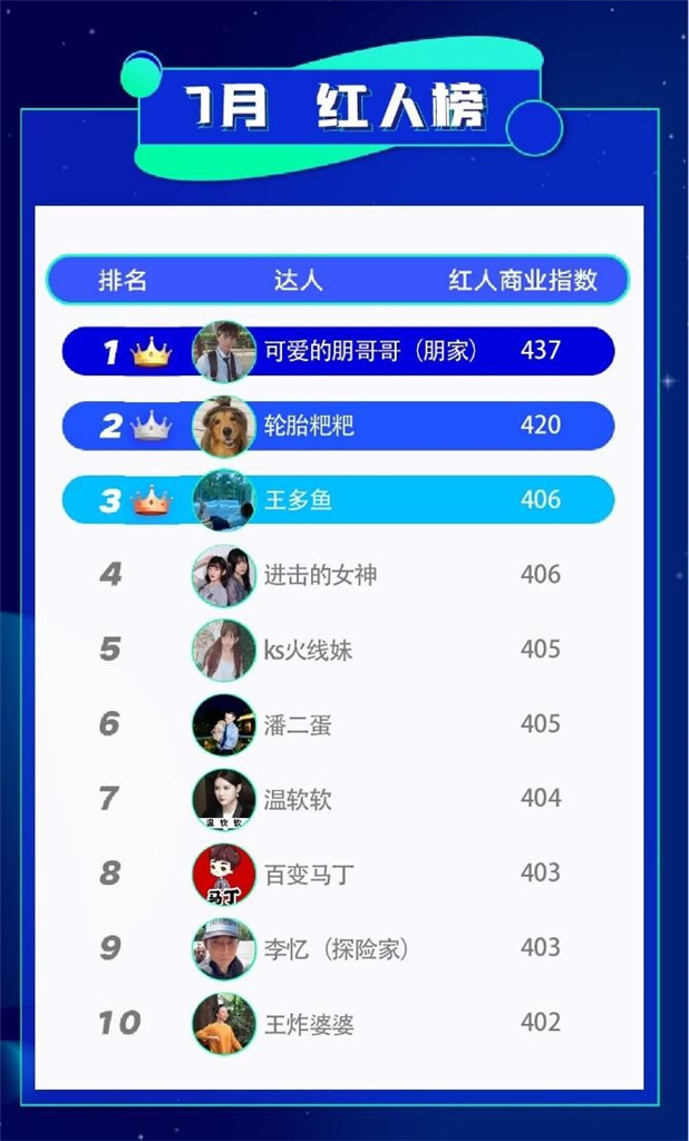 7月直播紅人榜單中,演員閆學晶、快手音樂人王逗逗、吃雞主播牧童等紅人上榜,體現(xiàn)了不同領域紅人在快手以多元直播內(nèi)容收獲了老鐵們的喜愛。