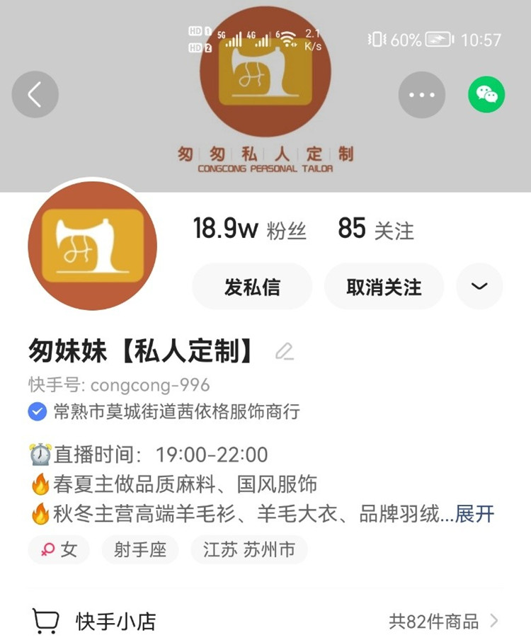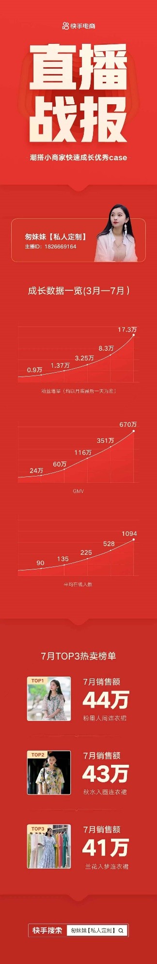 出于對(duì)服裝的熱愛,95后女生匆匆 (快手昵稱:匆妹妹【私人訂制】;快手ID:congcong-996)在上市公司工作一年后毅然離職,來到快手追尋自己的服裝夢(mèng)。在快手,匆匆不到半年就成長(zhǎng)為擁有18萬+粉絲、月GMV近700萬的小眾國(guó)風(fēng)潮流主播。