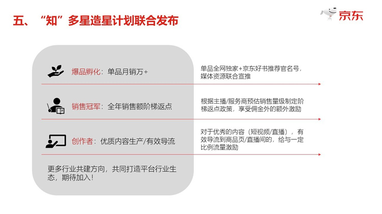 在“知”多星造星計劃中,對于“爆品孵化”能力較強的主播,將被授予京東好書推薦官的稱號,可以得到單品全網獨家發(fā)布資源;對于銷售能力極強的“銷售冠軍”級主播,將可享受傭金外的額外激勵;對于生產優(yōu)質短視頻或直播內容、且能實現(xiàn)有效導流的優(yōu)秀創(chuàng)作者,將給予一定比例流量的激勵?! ?br>