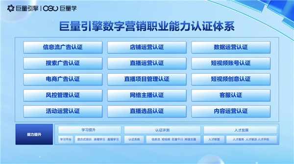 同時,巨量學緊跟行業(yè)發(fā)展趨勢,從企業(yè)經(jīng)營場景和目標出發(fā),推出了系統(tǒng)化的巨量引擎數(shù)字化職業(yè)技能認證體系,覆蓋信息流、短視頻、巨量千川、網(wǎng)絡(luò)主播等專業(yè)領(lǐng)域,對應(yīng)初級、中級、高級三個能力等級,進階式培養(yǎng)可識別的高含金量、高認知度、高專業(yè)度的新型數(shù)字營銷人才,助力企業(yè)業(yè)務(wù)增長,完善行業(yè)人才生態(tài)系統(tǒng)。