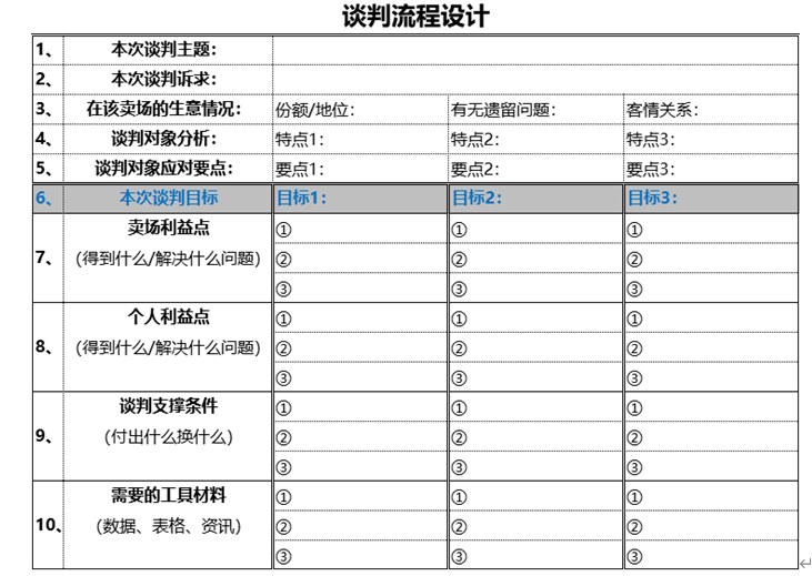 凡事預(yù)則立不預(yù)則廢,每次談判前,需要做功課。如下這個談判流程設(shè)計,對將要去談判的問題做個全面的梳理,相信談判的時候會掌控有度。