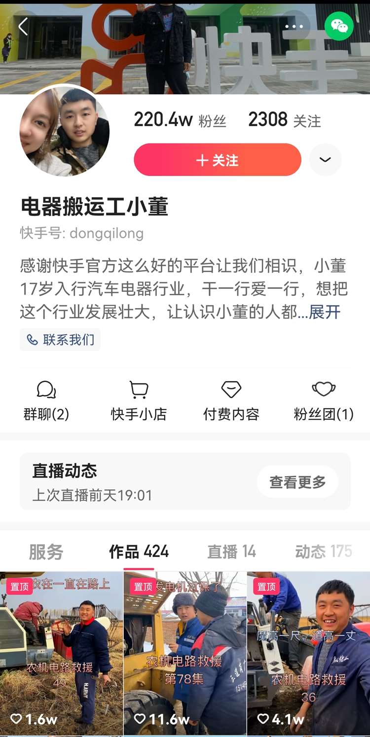 小董先從拍短視頻入手,但因?yàn)槿狈?jīng)驗(yàn),初期效果并不理想?!白铋_始就是發(fā)日常,隨便錄一錄我修車的生活,有時(shí)視頻突然上了熱門,點(diǎn)贊量很高,但關(guān)注的人很少,也不清楚原因?!焙脤W(xué)的小董上專業(yè)剪輯班向其他直播學(xué)習(xí),逐漸找到了門道,最終鎖定在自己最擅長(zhǎng)的農(nóng)機(jī)維修,一段時(shí)間之后,小董“教維修”讓賬號(hào)漲了12萬粉絲。后來小董還拍起了 “農(nóng)機(jī)電路救援”“農(nóng)機(jī)電路搶修”“農(nóng)機(jī)電路通病”等系列短視頻來展示修車日常,目前已更新了一百多集。