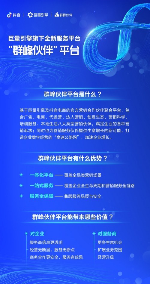 10月28日,2021群峰伙伴生態(tài)大會上,巨量引擎推出全新服務(wù)平臺“群峰伙伴平臺”。通過群峰伙伴平臺,客戶可以快速、高效且放心的選擇巨量引擎及抖音電商中各類優(yōu)秀服務(wù)商或購買營銷服務(wù)產(chǎn)品。