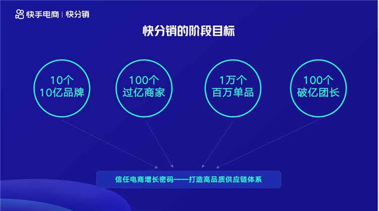“好物聯(lián)盟”業(yè)務(wù)與三個大搞戰(zhàn)略深度契合。在這樣的背景下,好物聯(lián)盟升級為快分銷,成為快手電商一級部門,并把階段目標設(shè)定為:打造10個10億+超級品牌,100個過億商家,1萬個爆款百萬單品,100個破億團長,通過高品質(zhì)供應(yīng)鏈打造,推動信任電商增長。