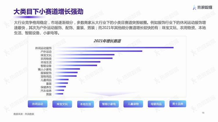 此外,大行業(yè)競(jìng)爭(zhēng)格局穩(wěn)定的情況下,市場(chǎng)逐漸細(xì)分,多數(shù)商家從大行業(yè)下的小類目賽道突圍破圈。例如服飾行業(yè)下的休閑運(yùn)動(dòng)服飾增速最快,其次為戶外運(yùn)動(dòng)服飾、配飾、童裝、男裝;而2021年其他細(xì)分賽道增長(zhǎng)較快的有:珠寶文玩、農(nóng)用物資、本地生活、智能設(shè)備、小家電等。