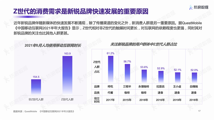 近年新銳品牌伴隨新媒體的快速發(fā)展不斷涌現(xiàn),除了傳播渠道的變化之外,新消費(fèi)人群Z世代是另一重要原因。據(jù)Quest Mobile 《中國(guó)移動(dòng)互聯(lián)網(wǎng)2021半年大報(bào)告》顯示,Z世代相對(duì)非Z世代的觸媒時(shí)間更長(zhǎng),對(duì)互聯(lián)網(wǎng)的依賴程度也更強(qiáng),同時(shí)其對(duì)新銳品牌的關(guān)注也比其他人群更甚。