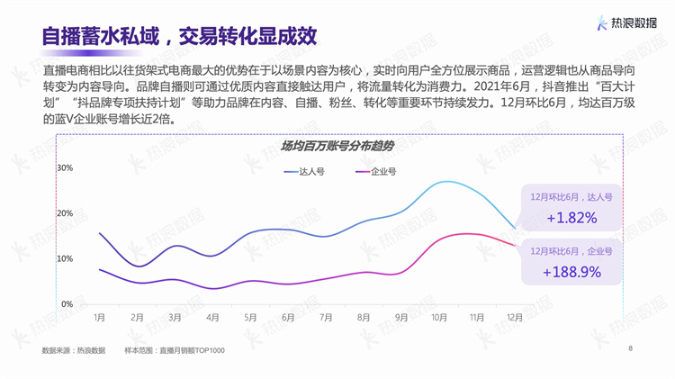 直播電商相比以往貨架式電商最大的優(yōu)勢(shì)在于以場(chǎng)景內(nèi)容為核心,品牌自播則可通過優(yōu)質(zhì)內(nèi)容直接觸達(dá)用戶,將流量轉(zhuǎn)化為消費(fèi)力。2021年6月,抖音推出“百大計(jì)劃” “抖品牌專項(xiàng)扶持計(jì)劃”等助力品牌在內(nèi)容、自播、粉絲、轉(zhuǎn)化等重要環(huán)節(jié)持續(xù)發(fā)力。12月環(huán)比6月,均達(dá)百萬級(jí)的藍(lán)V企業(yè)賬號(hào)增長(zhǎng)近2倍。
