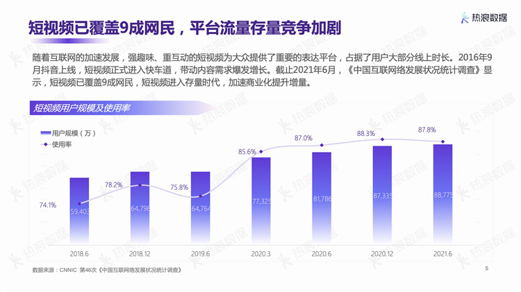 隨著互聯(lián)網(wǎng)的加速發(fā)展,強(qiáng)趣味、重互動(dòng)的短視頻為大眾提供了重要的表達(dá)平臺(tái),占據(jù)了用戶大部分線上時(shí)長(zhǎng)。2016年9月抖音上線,短視頻正式進(jìn)入快車道,帶動(dòng)內(nèi)容需求爆發(fā)增長(zhǎng)。截止2021年6月,《中國(guó)互聯(lián)網(wǎng)絡(luò)發(fā)展?fàn)顩r統(tǒng)計(jì)調(diào)查》顯示,短視頻已覆蓋9成網(wǎng)民。短視頻進(jìn)入存量時(shí)代,加速商業(yè)化,提升增量。