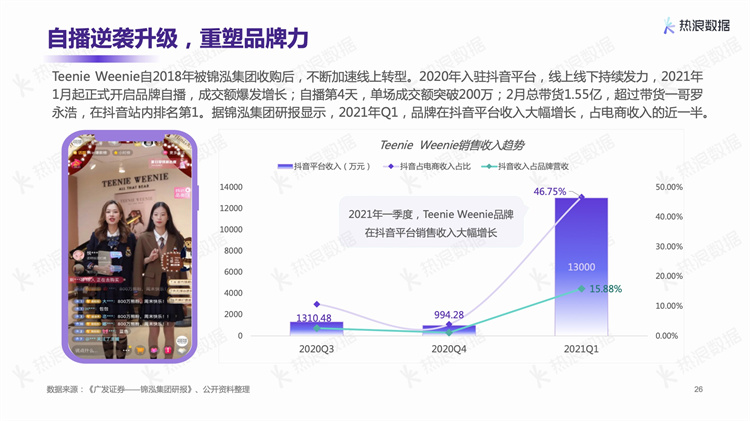 Teenie Weenie自2018年被錦泓集團(tuán)收購后,不斷加速線上轉(zhuǎn)型。2020年入駐抖音平臺(tái),精準(zhǔn)定為目標(biāo)人群,線上線下持續(xù)發(fā)力,2021年1月起正式開啟品牌自播,精細(xì)化運(yùn)營(yíng)品牌營(yíng)銷陣地,重塑品牌力,交易轉(zhuǎn)化進(jìn)一步提升。據(jù)錦泓集團(tuán)研報(bào)顯示,2021年Q1,品牌在抖音平臺(tái)收入大幅增長(zhǎng),占電商收入的近一半。