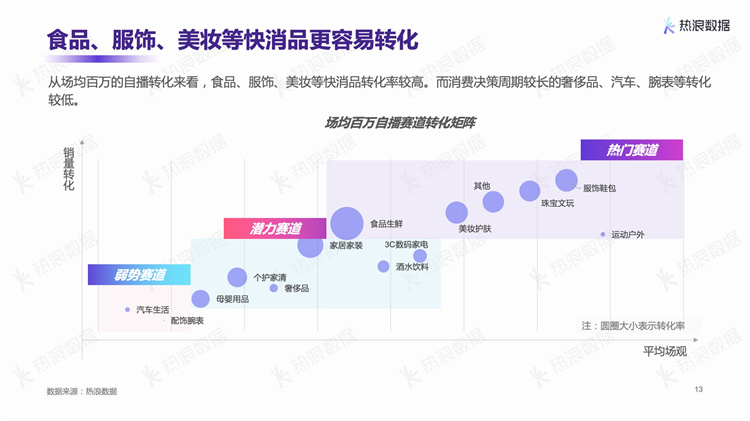服飾憑借其與興趣電商天然的耦合度最早入場(chǎng)。從百萬級(jí)自播賬號(hào)來看,服飾占據(jù)半壁江山。從場(chǎng)均百萬的自播轉(zhuǎn)化來看,食品、服飾、美妝等快消品轉(zhuǎn)化率較高。而消費(fèi)決策周期較長(zhǎng)的奢侈品、汽車、腕表等轉(zhuǎn)化較低。
