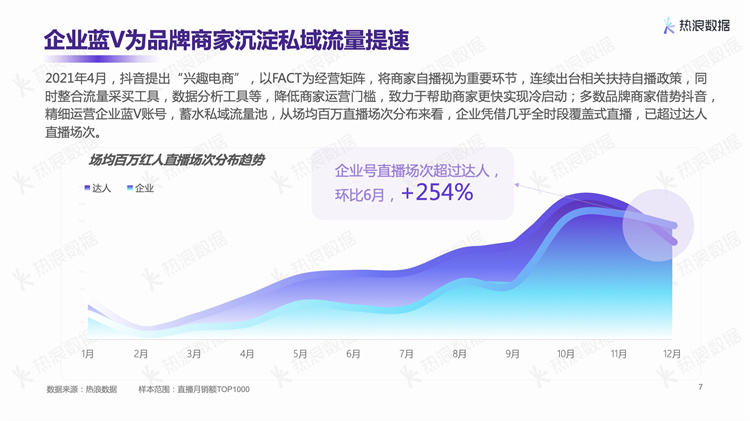 抖音提出“興趣電商”后,連續(xù)出臺(tái)相關(guān)扶持政策,幫助商家更快實(shí)現(xiàn)冷啟動(dòng);現(xiàn)多數(shù)品牌商家加速入場(chǎng),精細(xì)運(yùn)營(yíng)企業(yè)藍(lán)V賬號(hào),蓄水私域流量池;從場(chǎng)均百萬直播場(chǎng)次分布來看,企業(yè)憑借幾乎全時(shí)段覆蓋式直播,已超過達(dá)人直播場(chǎng)次。