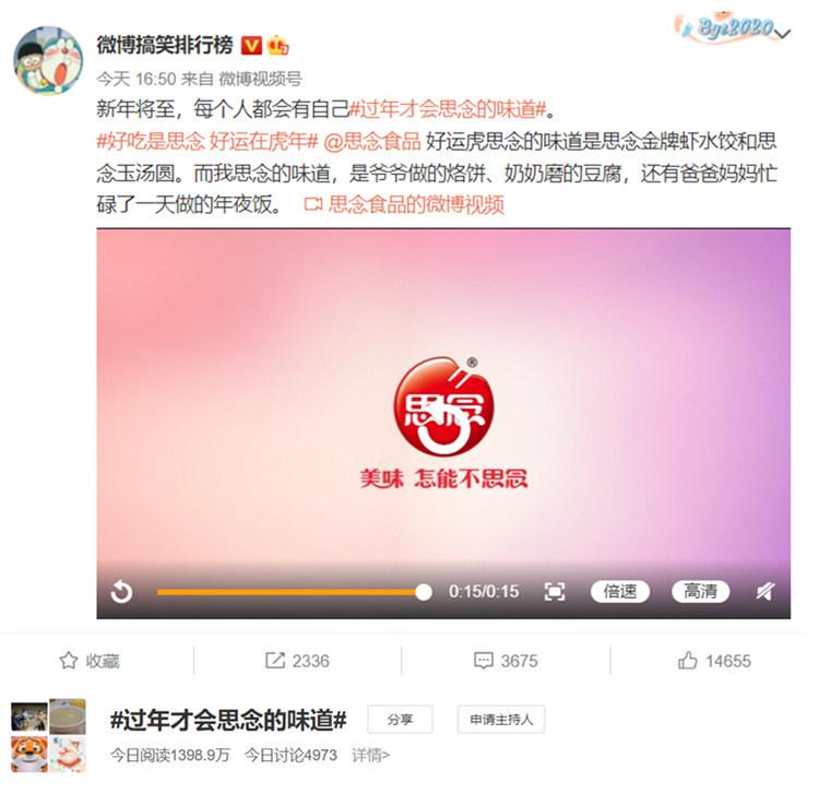 為配合TVC擴散,思念食品聯(lián)合榜姐打造了走心話題——#過年才會思念的味道#。廣大用戶在春節(jié)情緒的調動下,自發(fā)參與話題討論并留言傾訴了自己思念的味道。爆發(fā)當日,微博端話題#過年才會思念的味道#話題閱讀量達1398W+,思念食品巧妙借助“思念的味道”撩撥了用戶思念情緒,在新年之際引起了新一輪的思念風潮。