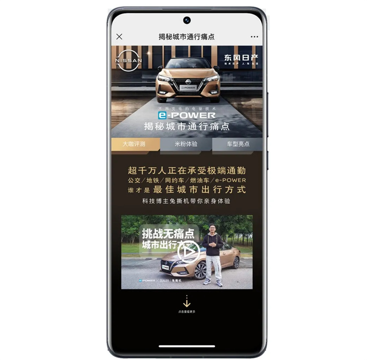 另一方面,是以社區(qū)米粉的城市通行痛點(diǎn)場景鏈接e-POWER。通過三位米粉跨城通勤、城市帶娃、上班堵車三大真實(shí)場景呈現(xiàn)e-POWER“快、順、靜、省”的無痛點(diǎn)城市出行體驗(yàn),帶出其“全時電驅(qū)”、“高效發(fā)電”、“閃充閃放”的技術(shù)亮點(diǎn),并在社區(qū)引發(fā)米粉共鳴,全面展現(xiàn)“米粉 e-POWER的真實(shí)城市生活”。