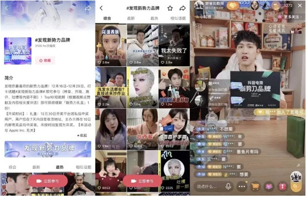 與此同時,針對站內(nèi)用戶,抖音電商以特色站內(nèi)挑戰(zhàn)賽玩法激發(fā)用戶參與興趣,用話題預(yù)埋、達(dá)人拍攝內(nèi)容短視頻等方式引起用戶自創(chuàng)內(nèi)容驅(qū)動用戶參與,形成自傳播擴(kuò)大聲勢。同時也為之后的big day、品牌自播等銷售環(huán)節(jié)進(jìn)行用戶種草和流量蓄水。截至目前,站內(nèi)話題#發(fā)現(xiàn)新勢力品牌 話題播放量已超過3100萬次,該話題在微博端閱讀量已超過1.1億,微博話題#新消費改變了什么#閱讀量也近5900萬次,產(chǎn)生近5萬人次討論。