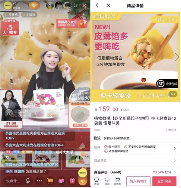 植物教授的14袋輕食餃產(chǎn)品是這次GMV爆發(fā)的主力,其能夠成為爆款,得益于周邊內(nèi)容投放以及短視頻預(yù)熱。植物教授以輕食控卡賣點對應(yīng)冬季養(yǎng)膘痛點,將囤貨心智進(jìn)行差異化透傳。在抖音電商平臺新勢力品牌活動加持下,植物教授不僅達(dá)到了銷量突破,其輕食控卡的健康飲食心智也同樣深入人心。