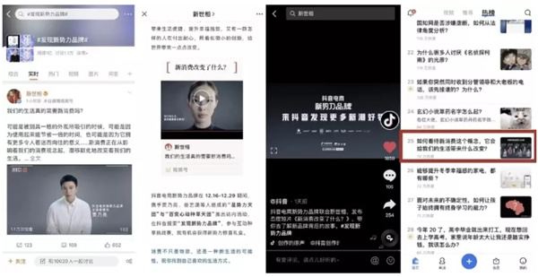 在品牌軟性建設(shè)中,以內(nèi)容傳播建立認(rèn)知陣地和流量陣地尤其重要,態(tài)度短片既集中展示了新消費品牌的正面形象,也為12月新勢力品牌活動奠定了整體傳播動作的規(guī)模和調(diào)性。抖音電商為活動品牌提供了跨平臺的宣發(fā)資源,幫助新品牌迅速提升知名度、美譽度,加速其破圈進(jìn)程。新世相作為年輕人心目中優(yōu)質(zhì)內(nèi)容的代名詞,也幫助新品牌增加認(rèn)知透傳力度、贏得用戶好感。
