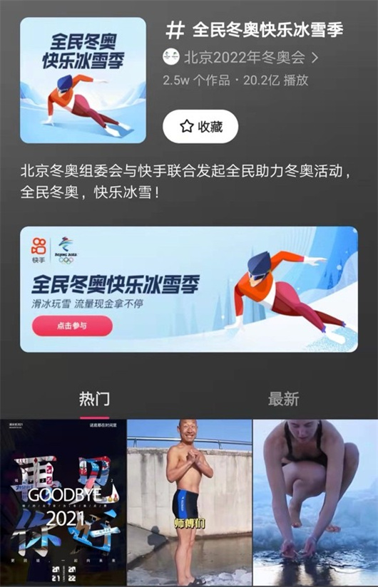 其中,由北京冬奧組委會(huì)與快手聯(lián)合發(fā)起的 “全民冬奧快樂(lè)冰雪季”短視頻挑戰(zhàn)賽將持續(xù)整個(gè)冬奧賽事期。用戶可以通過(guò)發(fā)布教學(xué)、科普、測(cè)評(píng)、種草、vlog、炫技等各類(lèi)冰雪類(lèi)原創(chuàng)內(nèi)容,或者對(duì)冬奧相關(guān)賽事精彩混剪及項(xiàng)目、人物、事件科普等二創(chuàng)內(nèi)容參與挑戰(zhàn)賽。目前該活動(dòng)的相關(guān)話題下短視頻作品總量已經(jīng)超過(guò)2.1W個(gè) ,相關(guān)話題累計(jì)播放量超過(guò)17.2億,顯示出平臺(tái)下用戶的高度參與熱情。