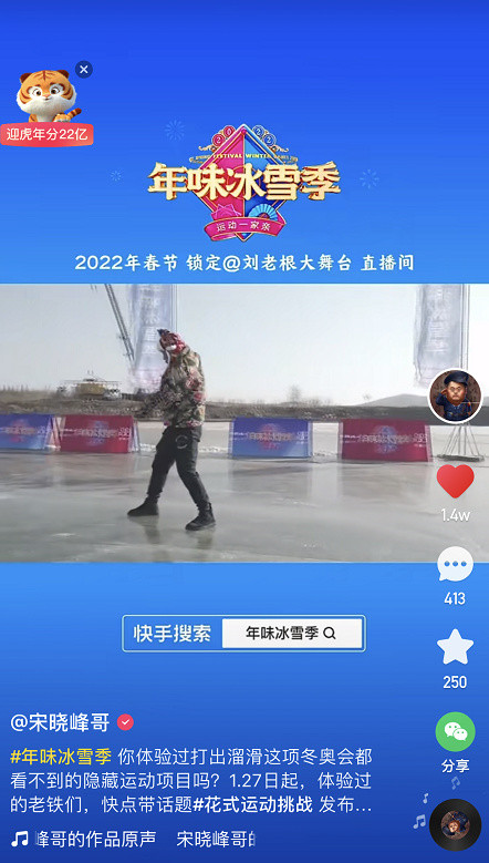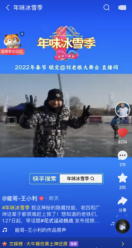 慶冬奧、迎新年,近日,快手聯(lián)合劉老根大舞臺打造冬季運動題材聯(lián)歡活動——年味冰雪季,圍繞“冬奧”、“冰雪”、“新年”為關(guān)鍵詞,展開一系列的花式冰雪玩法。目前,快手已上線花式運動挑戰(zhàn)、東北方言挑戰(zhàn)等內(nèi)容,宋曉峰、劉小光、楊樹林、王小利等一眾劉老根大舞臺成員在相關(guān)話題頁發(fā)布作品,展現(xiàn)不為人知的東北版冰雪技能。