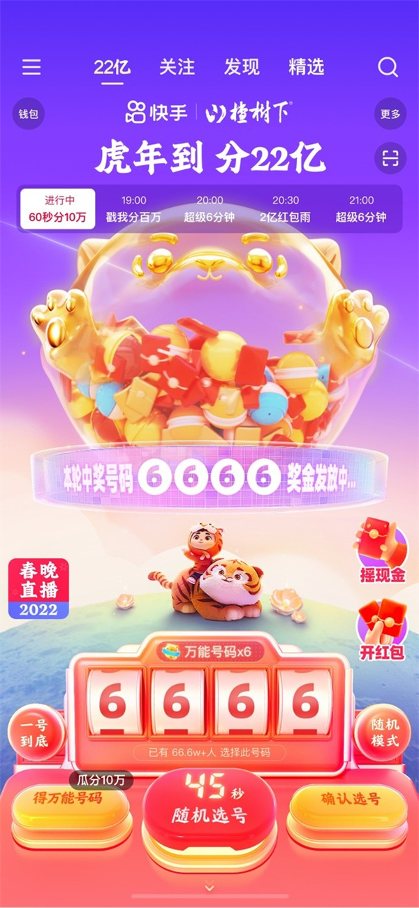 1月30日晚11點起,用戶打開快手,點擊頁面上方的“22億”標簽,或搜索“分22億”即可進入“選號抽獎”活動頁面。