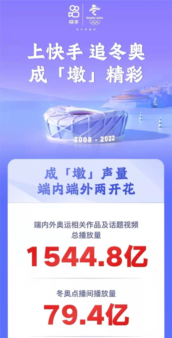 冬奧會期間,快手端內外冬奧相關作品及話題視頻總播放量再創(chuàng)新高,達1544.8億,端內冬奧點播間播放量超79億?!侗┛靾蟆?、《冰雪英雄》等五大自制節(jié)目總播冬奧自制節(jié)目總播放量超42.5億,為冬奧打CALL視頻總播放量突破708億,全民共同參與冬奧的氛圍在快手得到淋漓盡致的展現(xiàn)。