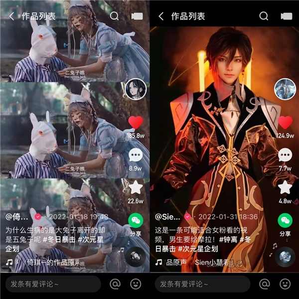 在活動(dòng)熱度加持下,眾多二次元達(dá)人產(chǎn)出了許多爆款視頻?!耙戌?”在其活動(dòng)作品之一“十只兔子”中,以精美造型演繹多層次故事情節(jié),單條視頻播放量高達(dá)8500萬;COS達(dá)人“Sien小慧君”為回饋女粉,反串cos王者榮耀角色鐘離,單個(gè)視頻播放超4700萬......優(yōu)質(zhì)內(nèi)容吸引眾多泛二次元圈層用戶,讓二次元達(dá)人們成功火出圈。