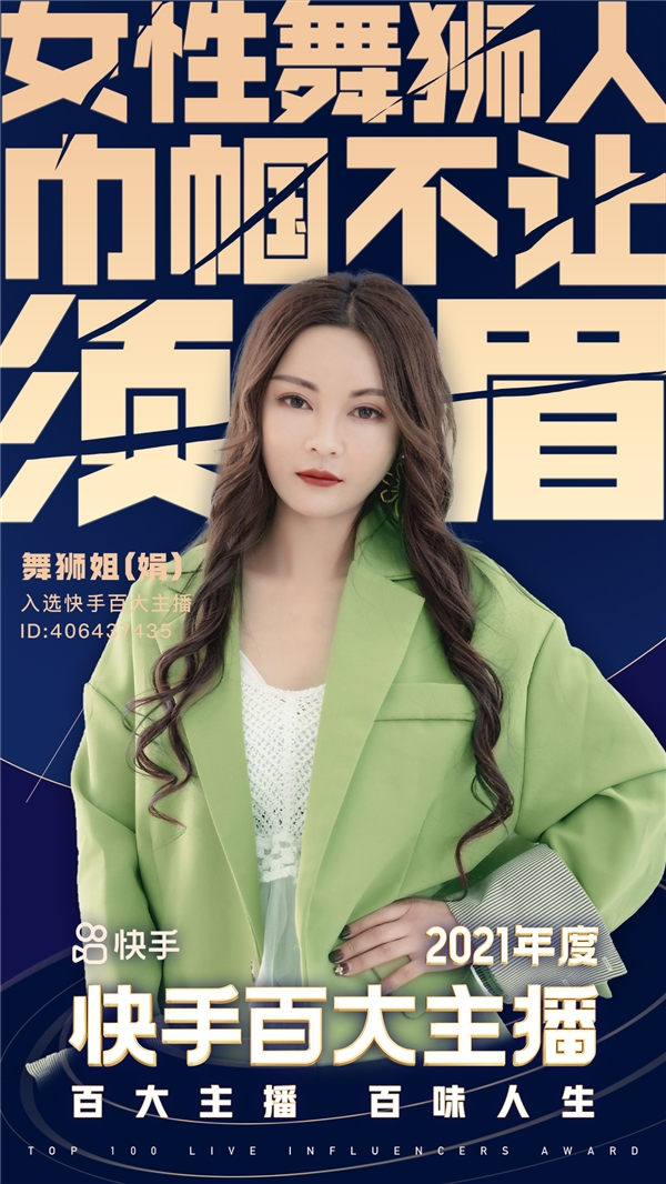 作為一個90后姑娘,舞獅姐打破性別刻板印象,帶上“獅子頭”跳進(jìn)了“職業(yè)舞獅人”的圈子,在線下贏得觀眾喜愛的同時,還在快手上擁有了近百萬的粉絲。近期,她更是憑借超高的人氣、過人的才藝成功入選2021年度“快手百大主播”。