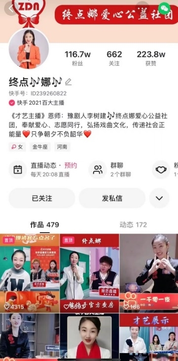生在豫劇之鄉(xiāng)河南的傅娜娜曾經(jīng)是一名劇團演員,而她在快手上還有另一個更被大家熟知的身份——一個擁有百萬粉絲的戲曲才藝主播“終點娜”,她在自己的主頁介紹中寫著:“奉獻愛心、志愿同行,弘揚戲曲文化,傳遞社會正能量?!倍潭?1個字,道出了她入駐快手平臺的初心與使命。