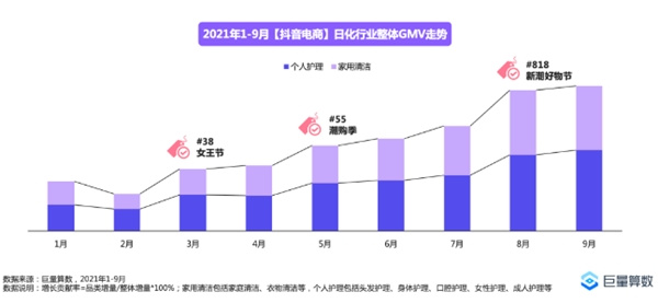 對(duì)于鮮花品類,春暖花開(kāi)即是天然營(yíng)銷季,增長(zhǎng)潛力十分旺盛;而對(duì)于個(gè)護(hù)家清行業(yè),初春節(jié)點(diǎn)也同樣是快速起勢(shì)的關(guān)鍵。從2021年數(shù)據(jù)來(lái)看,個(gè)護(hù)家清品類GMV在3月份便開(kāi)啟飆升之路,呈現(xiàn)一路上漲趨勢(shì)。