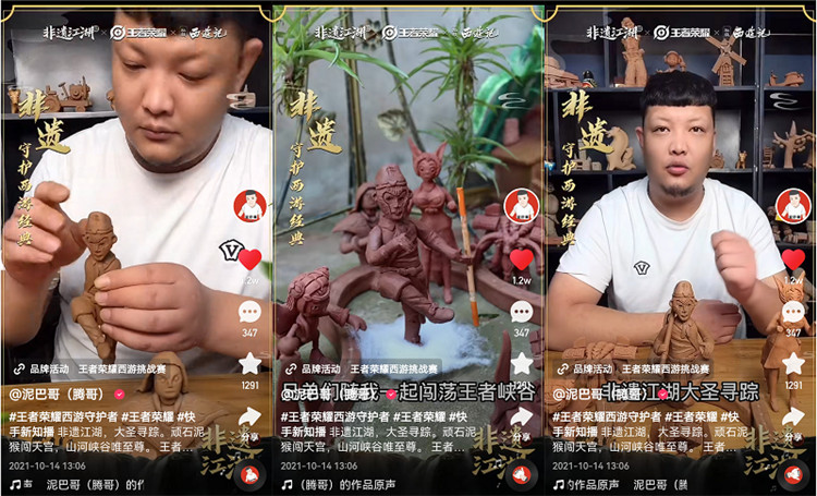 在快手非遺江湖聯(lián)合王者榮耀發(fā)起的“王者榮耀西游守護(hù)者”活動(dòng)中,泥巴哥用泥巴捏了一個(gè)齊天大圣,將泥塑文化和游戲內(nèi)容緊密聯(lián)系起來(lái)。配著《西游記》的經(jīng)典背景音樂(lè),泥巴做的齊天大圣破土而出,乘著筋斗云來(lái)到王者榮耀的水晶旁,帶著兄弟們一起闖蕩王者峽谷?!澳髠€(gè)泥娃娃,翻個(gè)筋斗云,來(lái)去無(wú)影動(dòng)乾坤”,栩栩如生的泥塑生動(dòng)展現(xiàn)了西游文化中的修煉和堅(jiān)守。