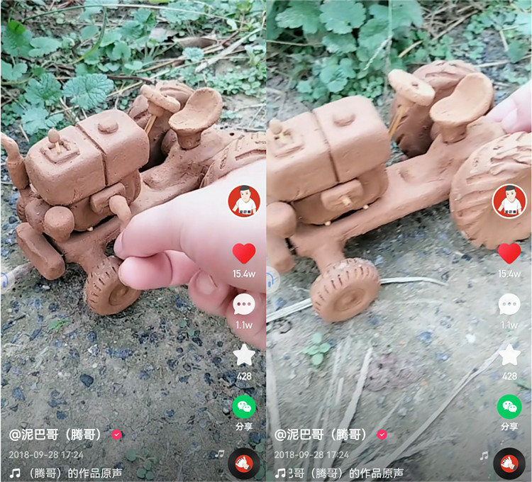 抱著試一試、玩一玩的心態(tài),泥巴哥在快手上發(fā)布了第一條泥塑短視頻。作為土生土長(zhǎng)的農(nóng)村孩子,泥巴哥捏了自己從小就常接觸的拖拉機(jī),并拍攝了一段推著泥巴拖拉機(jī)向前開的視頻,還自己配上了拖拉機(jī)發(fā)動(dòng)的聲音“騰騰騰騰騰”。