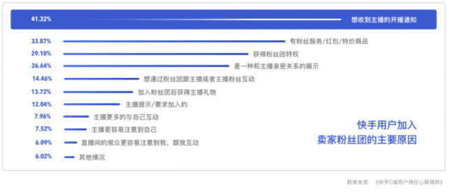 根據《快手C端用戶信任心智調研》,在快手,有41.32%的人因為“想收到主播開播通知”而加入經營者的粉絲團。78.59%的私域經營者借助平臺的私域經營工具賺到錢??傮w上,快手私域貢獻了70%的電商交易額、80%的直播打賞金額。