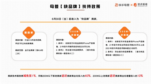 接下來,快手電商也將致力于母嬰市場的發(fā)展與拓寬,為各大品牌和中小商家發(fā)展提供更多支持。在“快品牌”扶持方面,5-6月新商家可享受商家技術(shù)服務(wù)費減免至1%扶持,月銷200W以下新老商家返還商家商業(yè)化投入的40%,200W以上老商家返還商家商業(yè)化增量投入的10%。