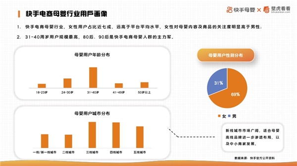 行業(yè)快速增長背后,快手電商母嬰消費者呈現(xiàn)出鮮明特征:女性用戶占比近七成,遠(yuǎn)高于平臺平均水平;31-40周歲用戶規(guī)模最高,80后、90后成為快手電商母嬰人群的主力軍;新線城市市場廣闊,適合母嬰高線品牌進一步滲透布局,以及中小商家發(fā)展。