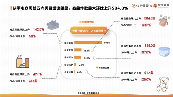 在市場規(guī)模、平臺支持、消費驅(qū)動、商家入局多因素驅(qū)動下,快手電商已經(jīng)成為母嬰消費的重要賽道。白皮書顯示,2021年下半年,快手電商母嬰行業(yè)發(fā)展勢能迅猛,商品量、銷售額保持穩(wěn)定上漲,第四季度GMV環(huán)比增長149.7%。童裝童鞋、母嬰食品、尿褲濕巾、嬰幼洗護、兒童玩具母嬰五大類目增速明顯,商品件數(shù)最大環(huán)比上升584.8%。